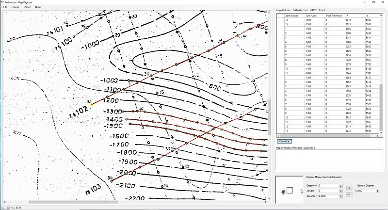 Should digital navigation data not already exist, it can be captured from base-map images. We use a leading map digitizing package which enables us to capture this information and convert between all common projection systems. Shot-points, wells, contours, boundaries and faults etc. can all be captured. Similarly, we can capture elevation information from seismic sections and load it into the vectorized SEG-Y trace headers.